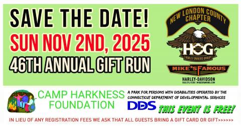 Riders and spectators—gear up for one of Southeastern Connecticut’s most heartwarming motorcycle traditions! The New London County H.O.G. Chapter and Mike’s Famous Harley-Davidson present the 46th Annual Gift Run, benefiting individuals and families served by the Department of Developmental Services and the Camp Harkness Fund.
